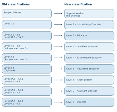 A key component of the gender-based undervaluation determination is the new, simplified classification structure of employees under the Children’s Services Award (2010).