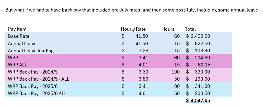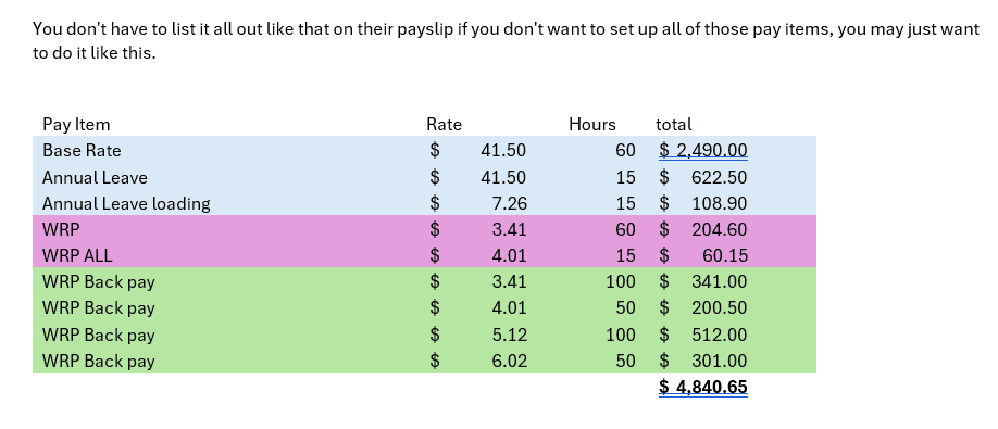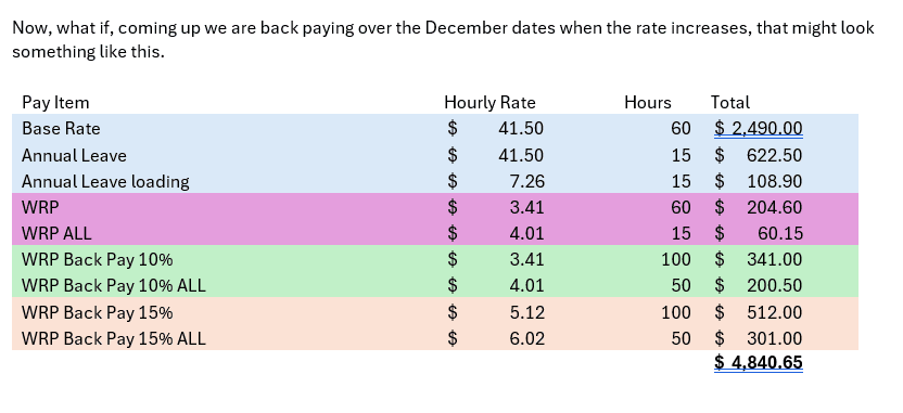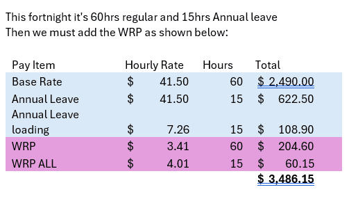 💡 You should set up WRP in your payroll so it is clearly identifiable. This generally means creating: a single allowance line (e.g. “WRP Allowance”), or separate categories (e.g. “WRP – Regular” and “WRP – Backpay”). In addition, WRP must also be identifiable when applied to leave (e.g. a separate line such as “WRP/Leave”). The exact set-up will depend on your payroll system, but what matters is that WRP is clearly identifiable across regular hours, backpay, and leave entitlements.